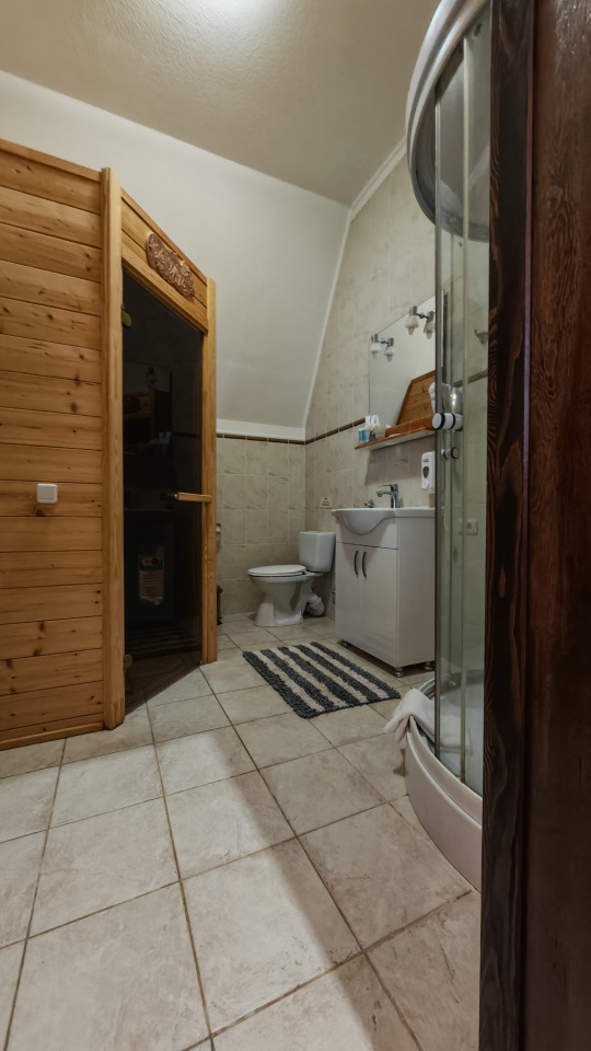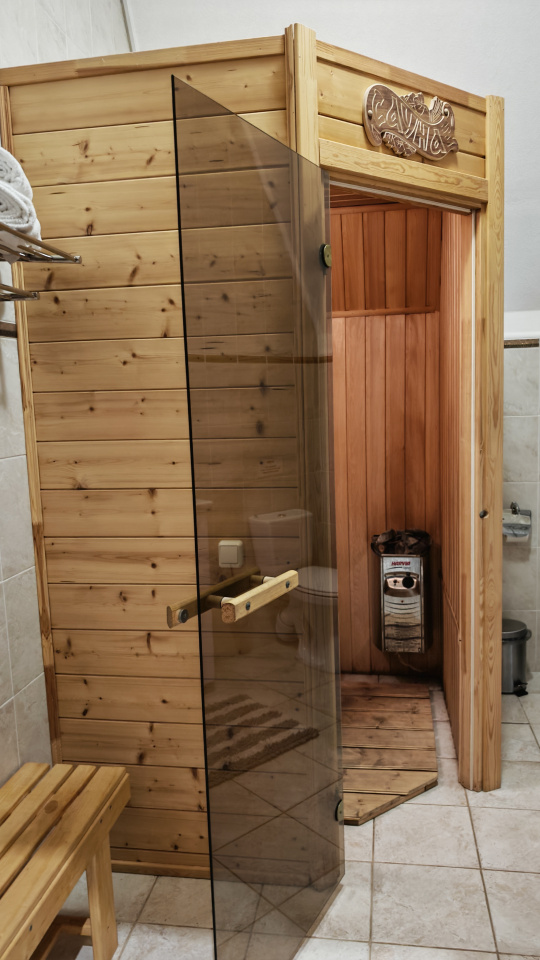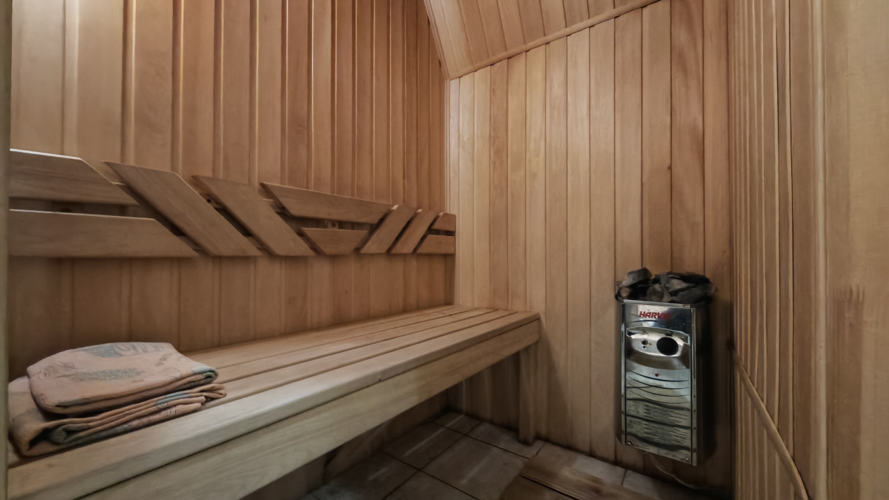 Сауна электрическая, 2 телевизора, элитная сантехника, отделка натуральным массивом дерева, кухонная зона.